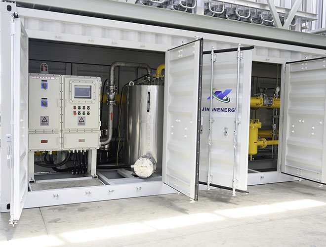 調(diào)壓計量撬是經(jīng)過主氣化器氣化后的氣體,由于等壓氣化壓力基本保持和儲罐壓力相近,一般用戶需求壓力是一個恒定的范圍內(nèi)的值,需要進行調(diào)壓穩(wěn)壓。同時為了計量核算費用或廠內(nèi)核算成本,對氣化后的LNG流量進行計量,為了實現(xiàn)以上的功能組合在一起的裝置叫調(diào)壓計量撬。由矩形撬塊、調(diào)節(jié)匯管、控制閥、計量管、流量計、調(diào)節(jié)閥、調(diào)節(jié)管、過濾器、出氣管、進氣匯管、進氣口、出氣匯管、排污管和安全放氣閥組成。有的裝置內(nèi)需要加入加臭系統(tǒng)。